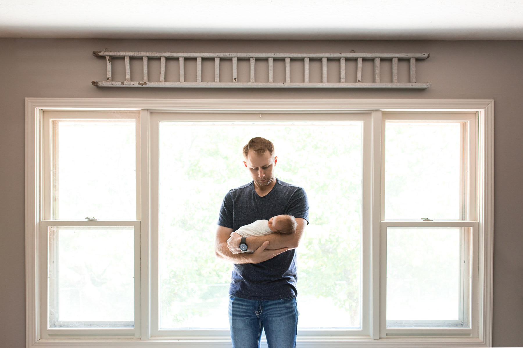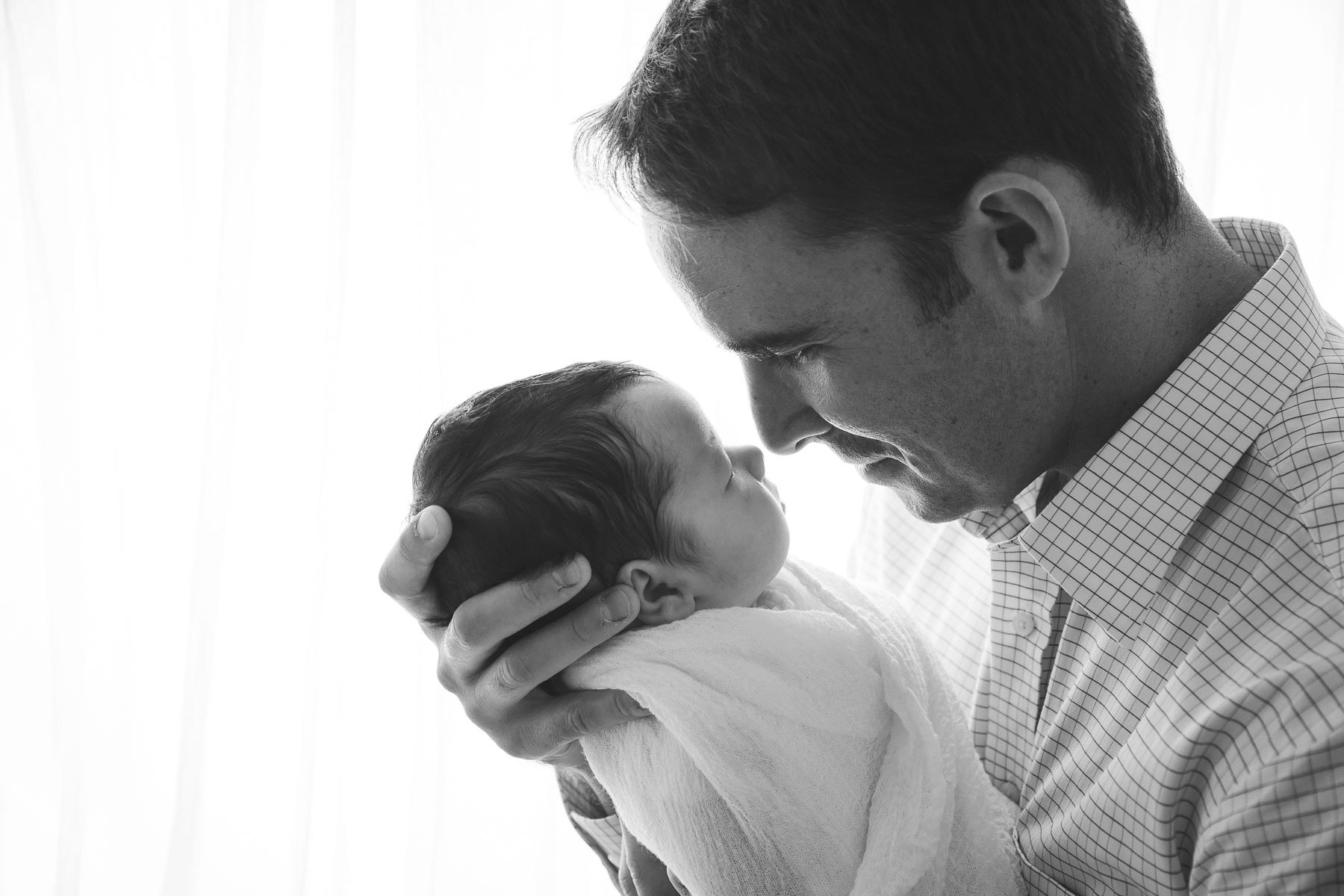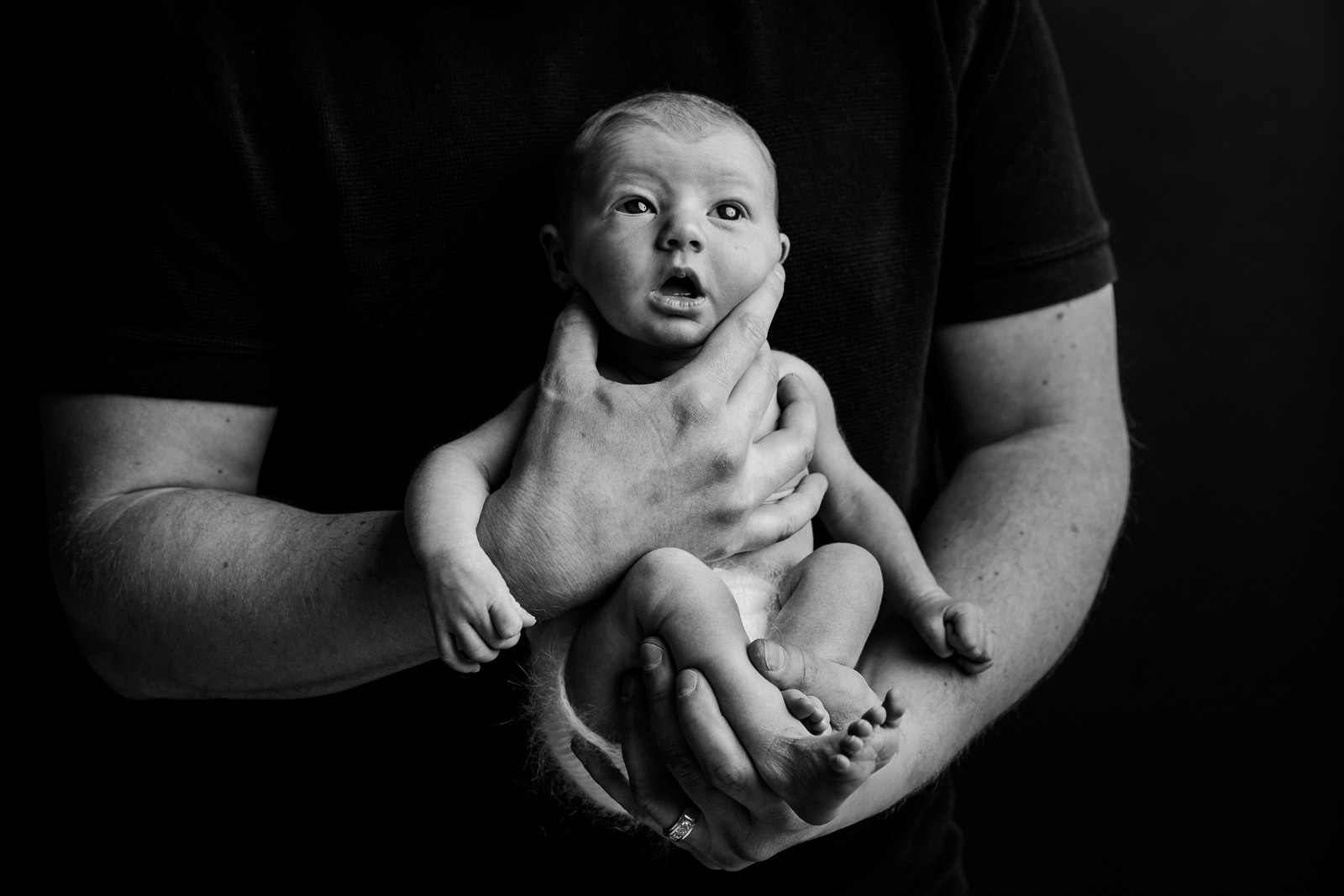 Dad holding newborn head in his hands with side lighting converted to black and white during studio photo session in Manhattan, Kansas by Amy Meng Photography