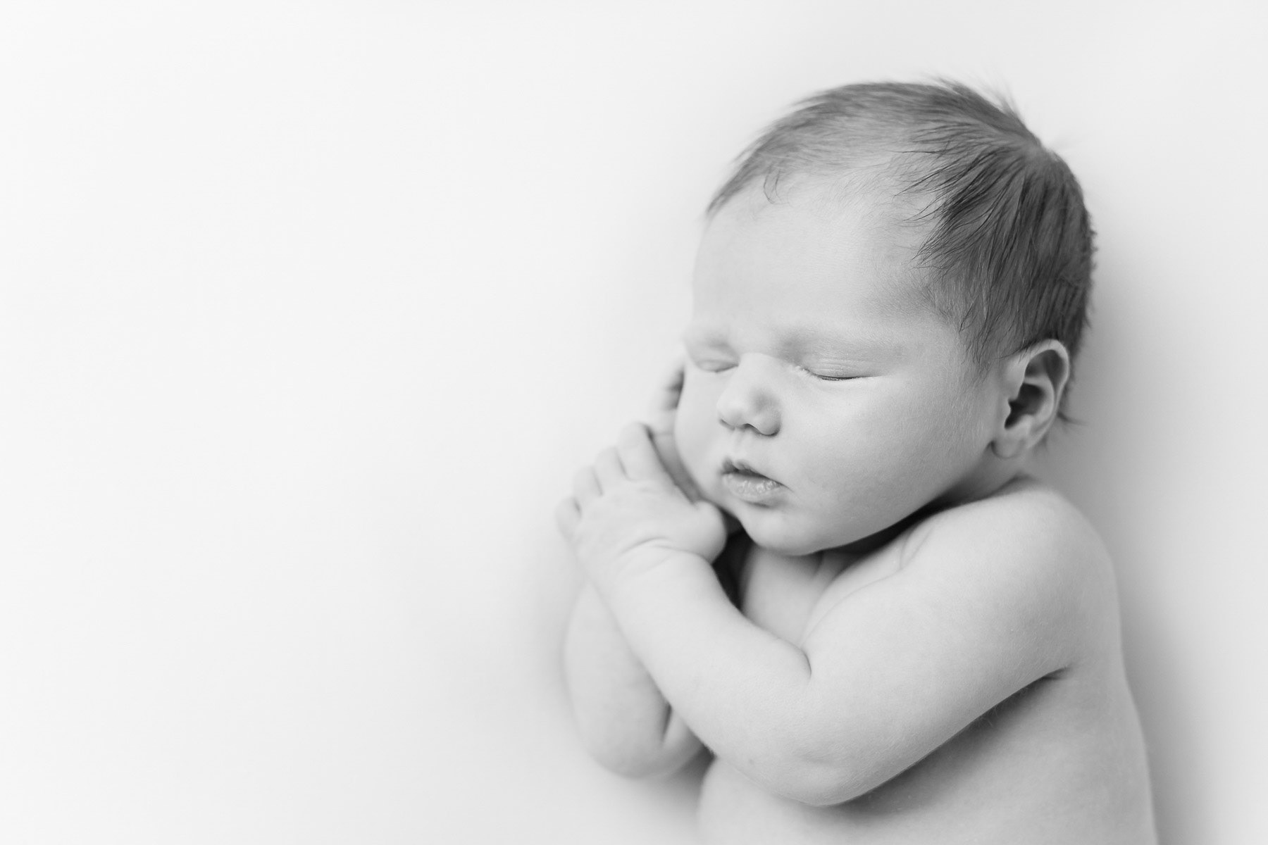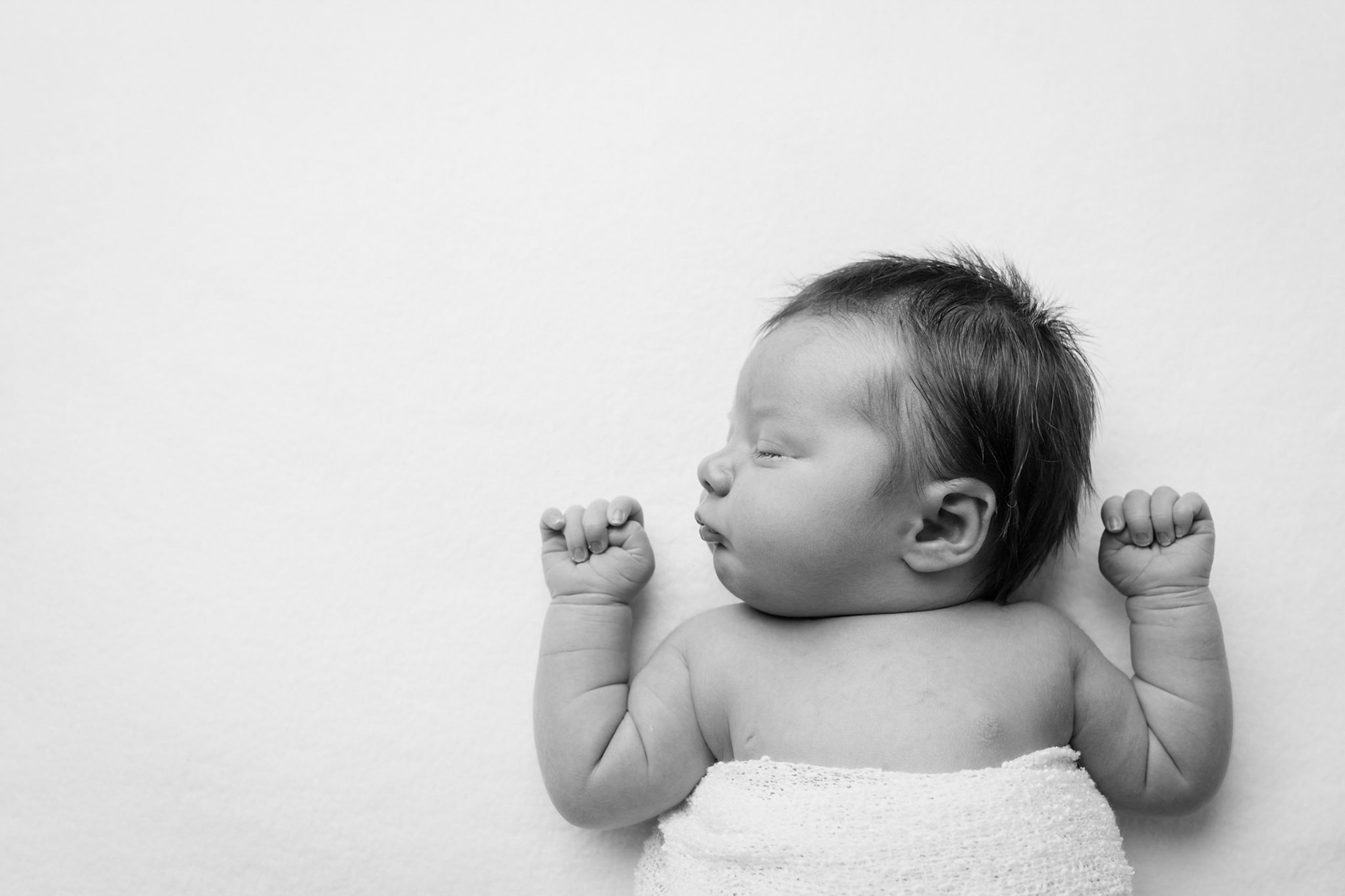 Newborn looking at cameara wrapped in white cloth on white backgroun in studio photo session in Manhattan, Kansas captured on 30 October 2018 by Amy Meng Photography